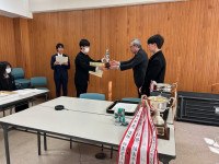 全校集会に先立ち行われた賞状伝達式では,写真部・囲碁部・将棋部・SS部・剣道部・バドミントン部・アーチェリー部・有志団体の皆さんに,校長先生から賞状が伝達されました。福島ロケットチャレンジ2024で優勝した有志団体の皆さんをはじめ,県大会で優勝・上位入賞を果たした皆さんおめでとうございました。これからも力を合わせて活動し,さらなる高みを目指して頑張ってください。